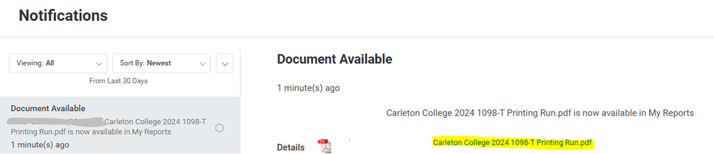 3.) After printing, the 1098-T PDF will be generated, and you can find the link to open the PDF file in your Workday notifications. (bell icon in the upper right-hand corner of your screen)