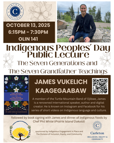 Followed by book signing with James and dinner of Indigenous foods by Chef Phil White (Prairie Island Dakota)
