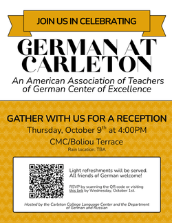 Carleton’s German Department has been officially recognized as an AATG Center of Excellence -- a national honor celebrating Carleton’s excellence in German teaching and learning! Join us in celebrating this prestigious designation.