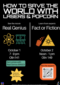 Real Genius shows what creative and smart people can do when they are given motivation, combined with time, money, and/or a community, to do their work. However, is everything they show in the movie actually possible or even plausible? Bring your lunch and we'll spend Common Time on Thursday, October 2nd, in Olin 149 with a Real Genius-Focused Mythbusters and a panel of faculty to answer your questions about Truth and Fiction in the movie Real Genius.