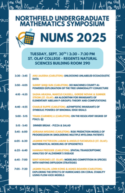 Each year Carleton and St. Olaf students work on a variety of interesting research problems in mathematics, both here in Northfield and around the country.  Several students will be sharing the work they did this past summer at the 2025 Northfield Undergraduate Mathematics Symposium.