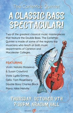 Two of the greatest classical music masterpieces that feature the Double Bass. The CarleMac Quintet is made of some of the regions top musicians who teach at both music departments of Carleton and Macalester Colleges.