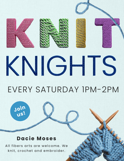 Knit Knights meets each week in Dacie Moses to work on fiber arts. It's a welcoming and calm environment for all who may wish to learn a new craft or just continue working on existing projects. Whether you've never picked up a crochet hook before or you've been knitting since you were 8, we would love if you joined us.
